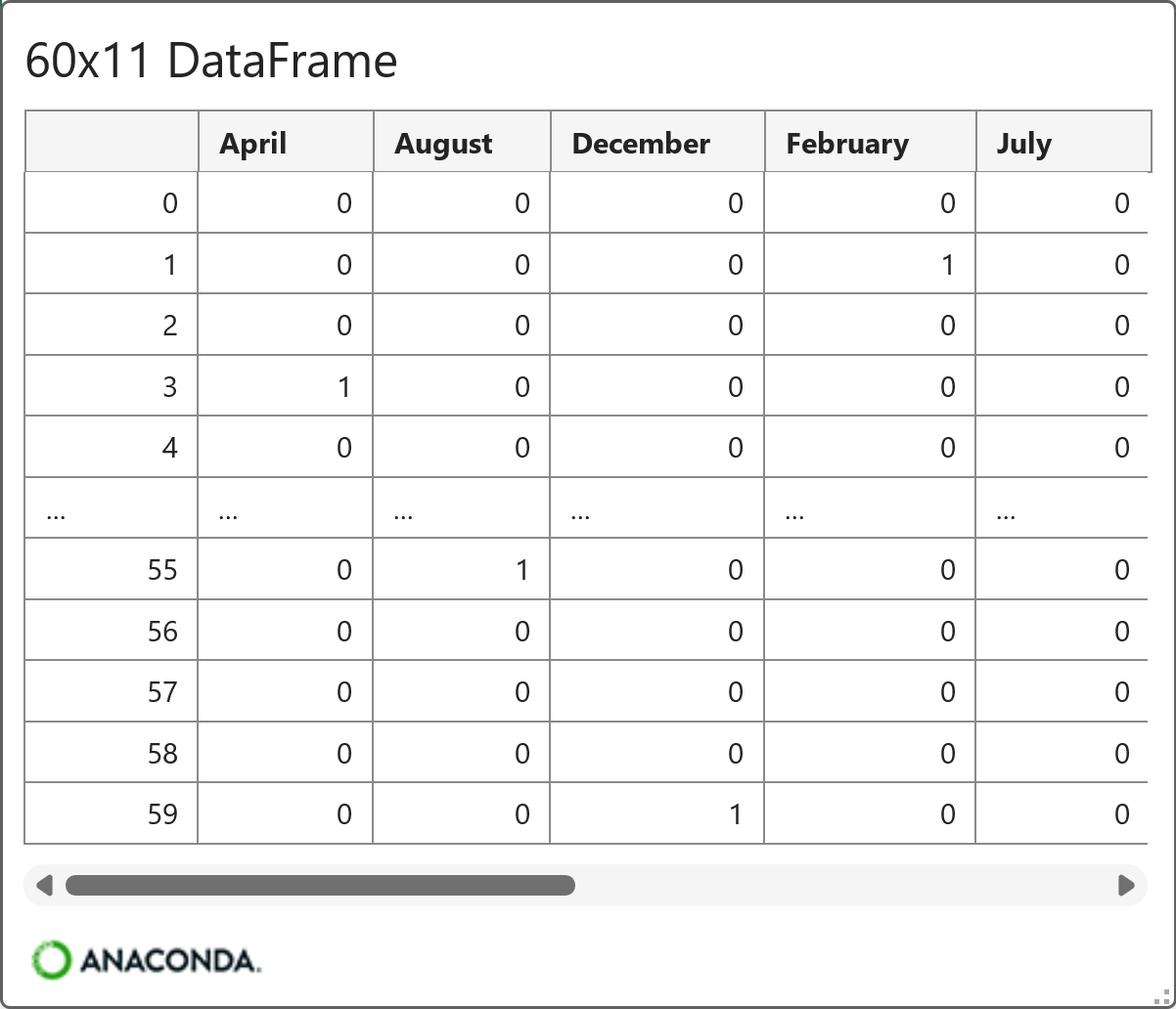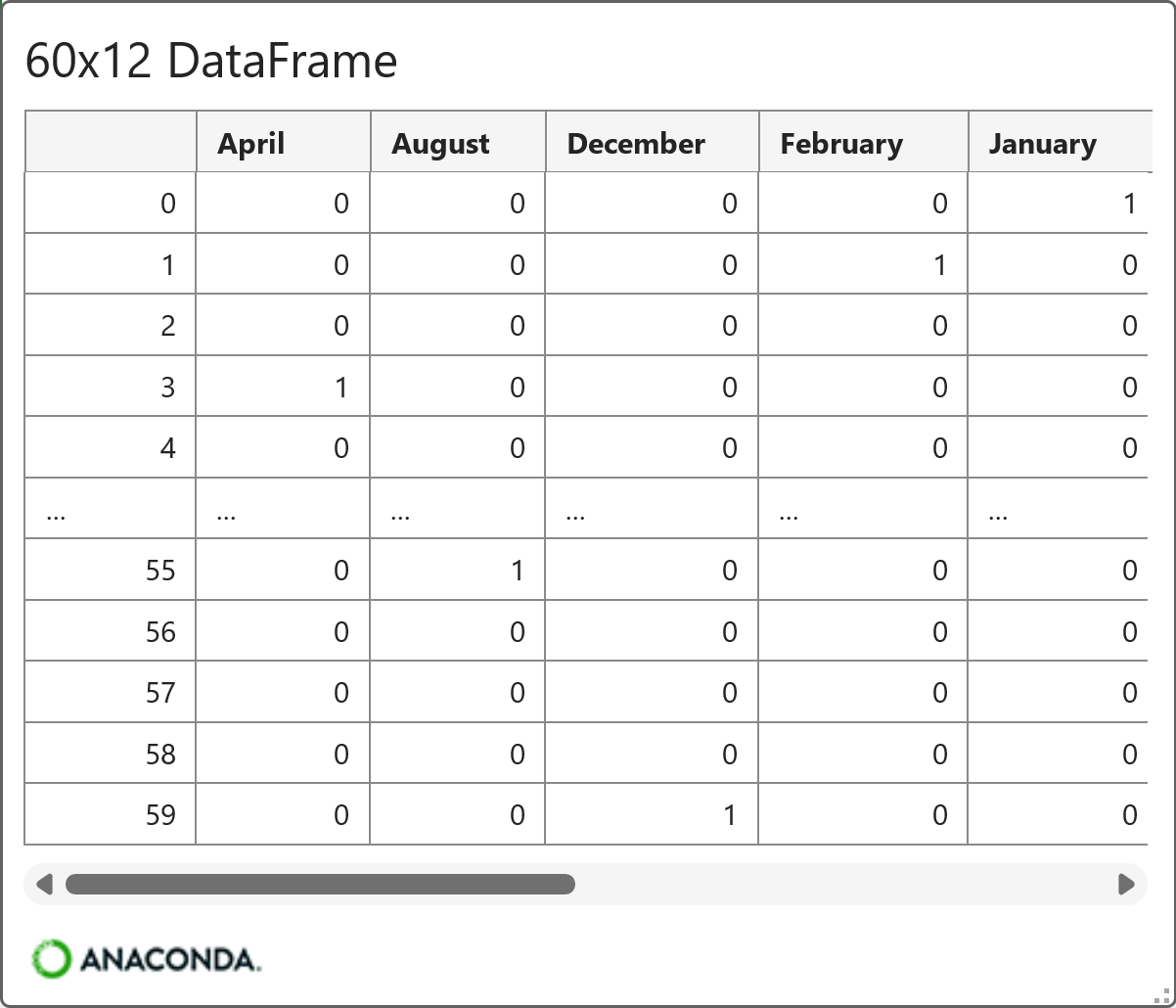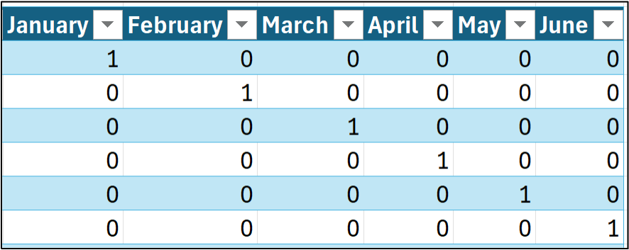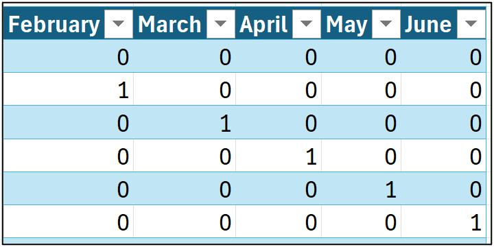 As shown in the image above, each month name (i.e., category) becomes a distinct binary feature. A value of 1 indicates that a category applies to a row of data, while a value of 0 means that it does not.