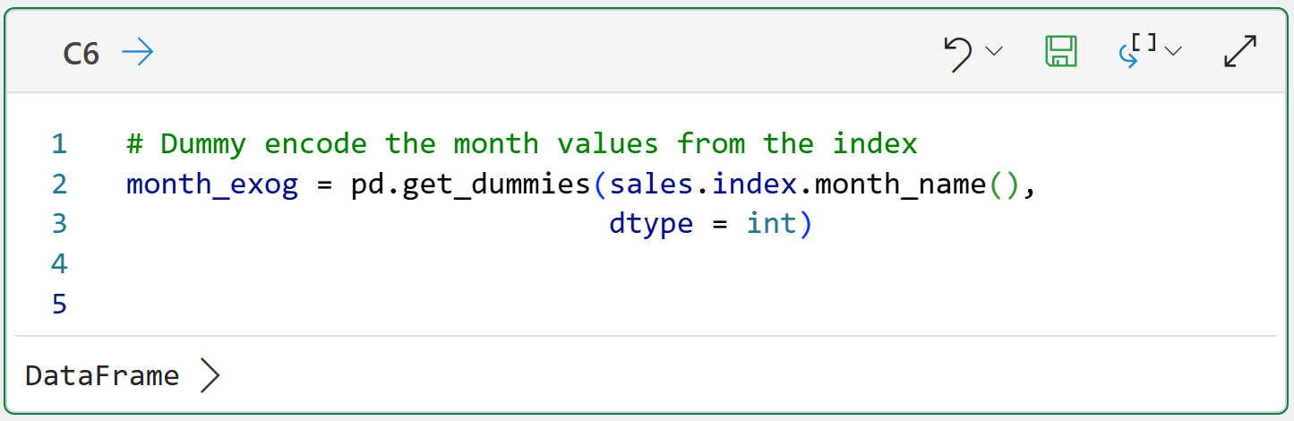 First, the get_dummies() function returns a DataFrame of the encoded features. The code assigns the DataFrame to the month_exog variable (I like to use the exog suffix to denote exogenous features).