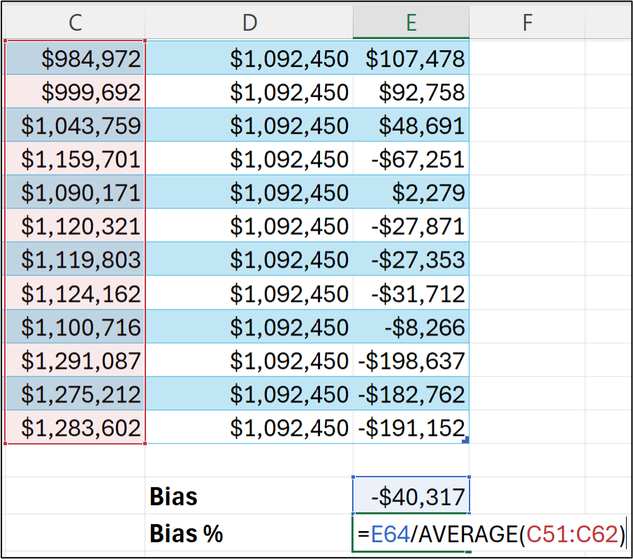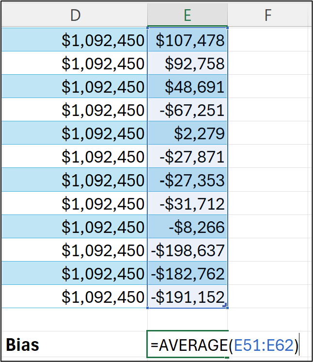 Think of the calculation in cell E64 of the Sales worksheet as combining all the test dataset forecasts and telling you, on average, if the test forecasts are too low or too high:
