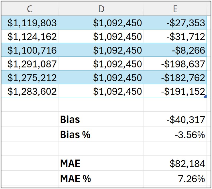 As you can see in the image above, the forecasts are both too high (e.g., an error of $48,691 for March 2024) and too low (e.g., -$191,152 in December 2024).