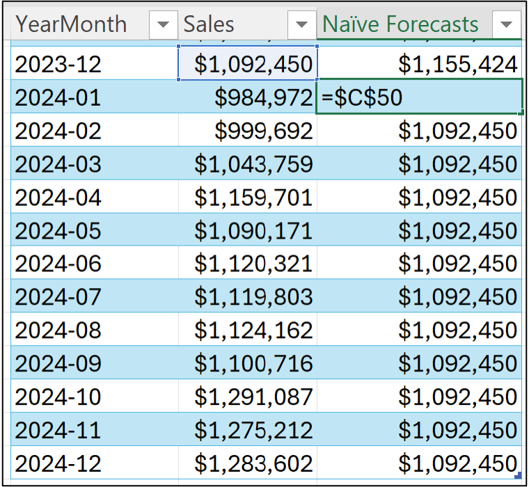 Here are the forecasts for the test dataset (I'm showing both the formula for the forecasts and the fact that the formula has been dragged down the table):