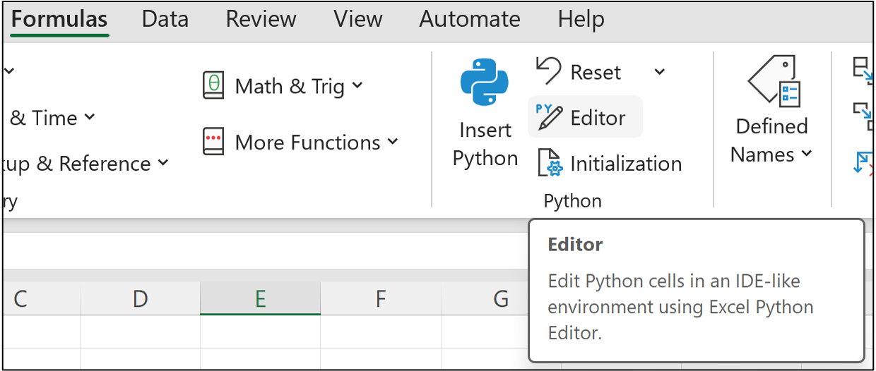This opens the Python Editor pane where you can click a button to create a new Python formula in cell C2: