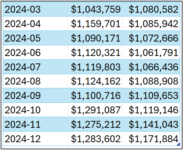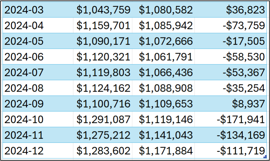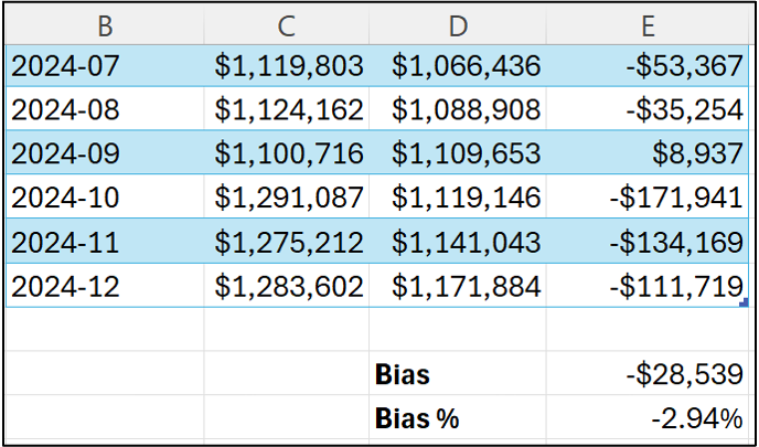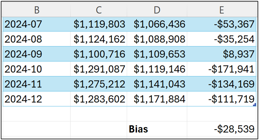 As you can see in the image above, the forecasts are both too high (e.g., an error of $36,823 for March 2024) and too low (e.g., -$111,719 in December 2024).