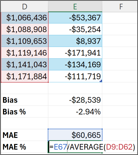 The MAE % is the average absolute error divided by the average target value and tells us that the forecasts are off by 6.24% on average.