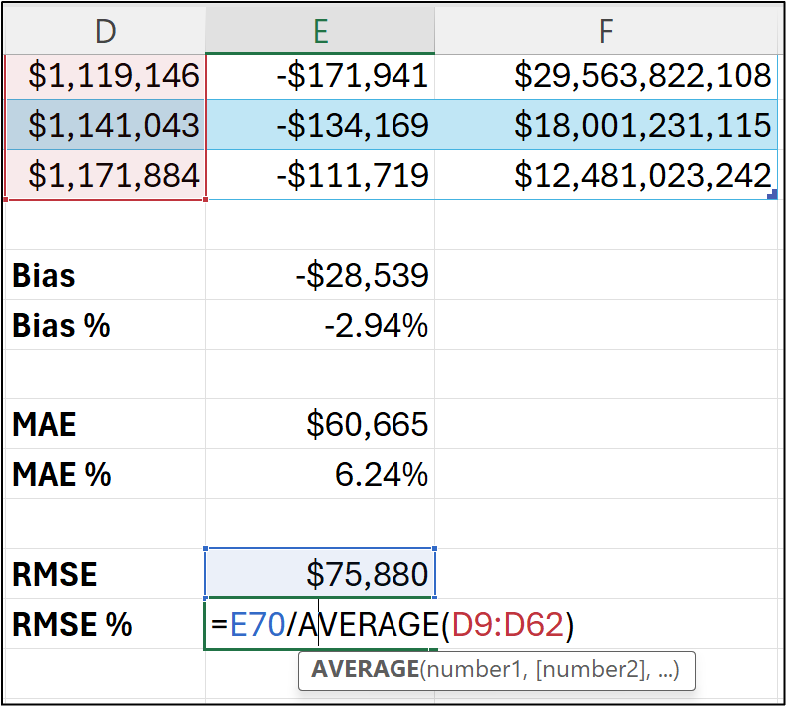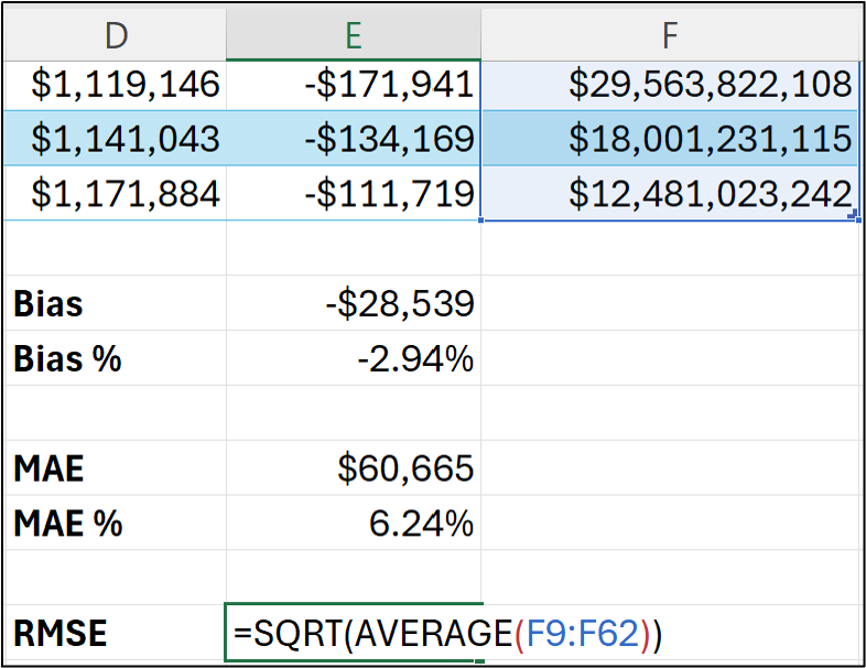The RMSE calculation is a little more complicated than bias and MAE. So, I rarely communicate this KPI to business stakeholders.
