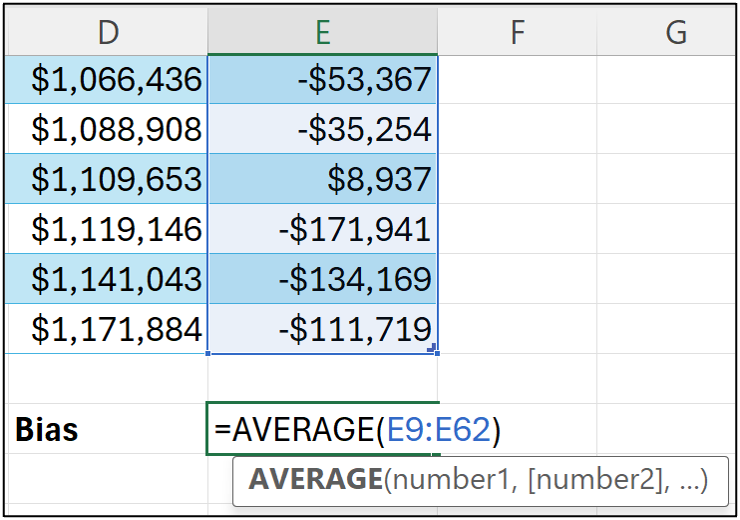 If you're unfamiliar, Excel's ABS() function stands for absolute value. Basically, think of this function as turning the negative errors into positive errors and leaving positive errors unchanged: