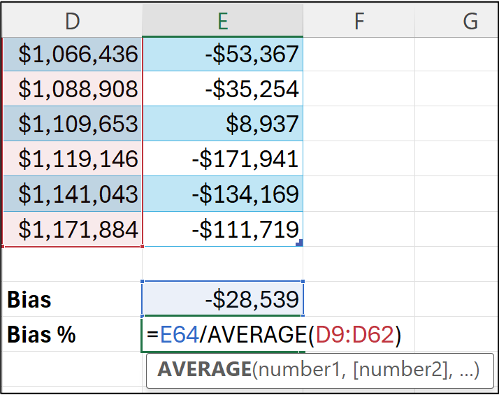 Think of the calculation in cell E64 of the Sales worksheet as combining all the forecasts and telling you, on average, if the forecasts are too low or too high: