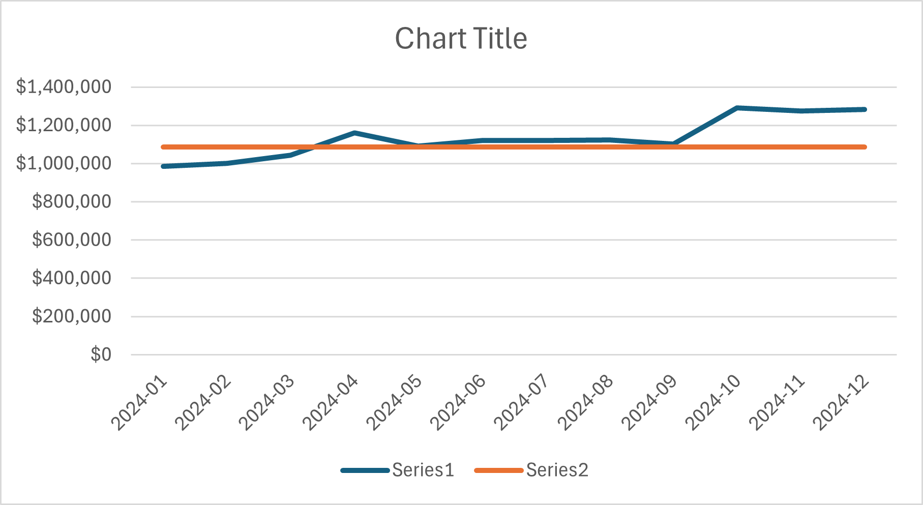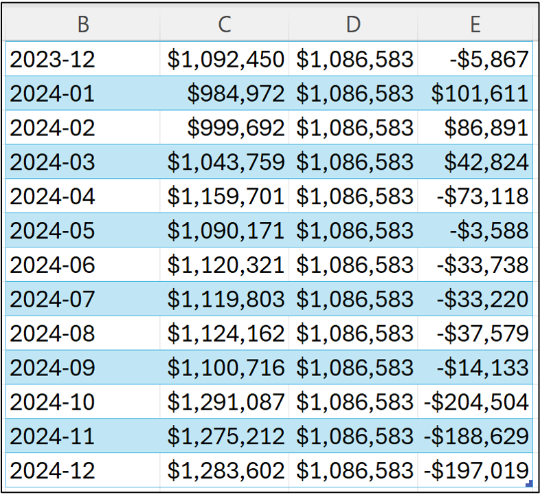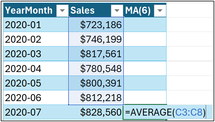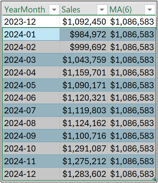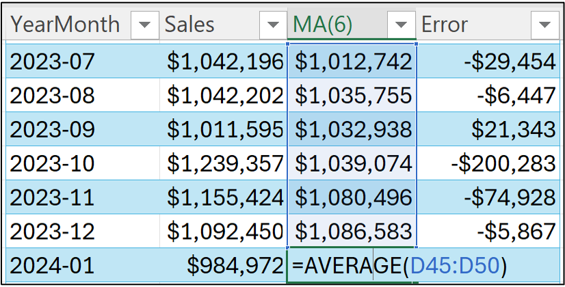 Given my choice of reserving the last year of data for testing (often referred to as the test holdout), I drag the MA(6) formula down the length of the table and stop at the end of 2023: