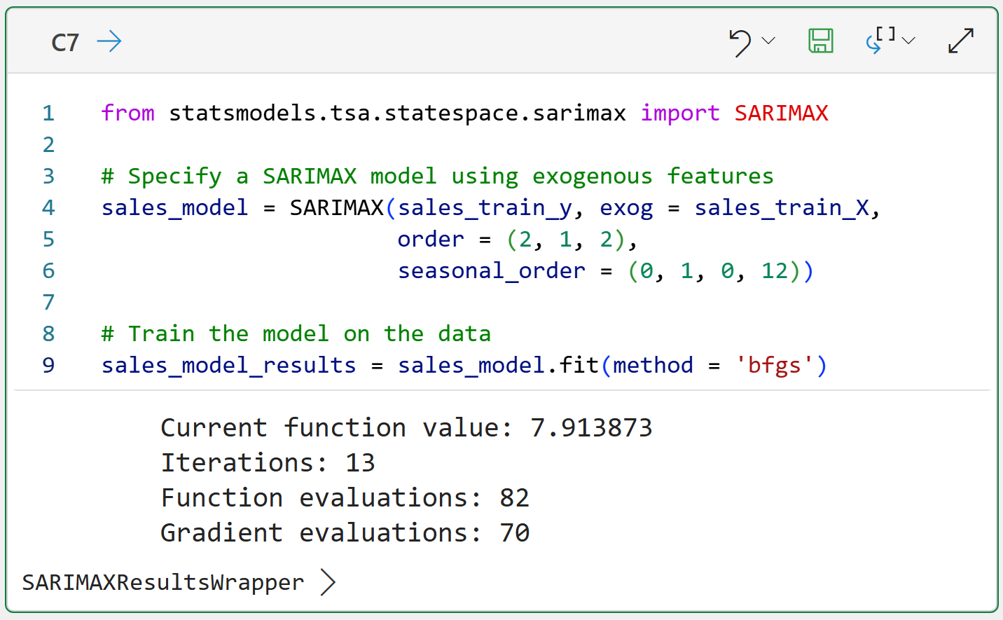 For the purposes of this tutorial, here's a SARIMAX model that works well with the Sales and MarketingSpend features: