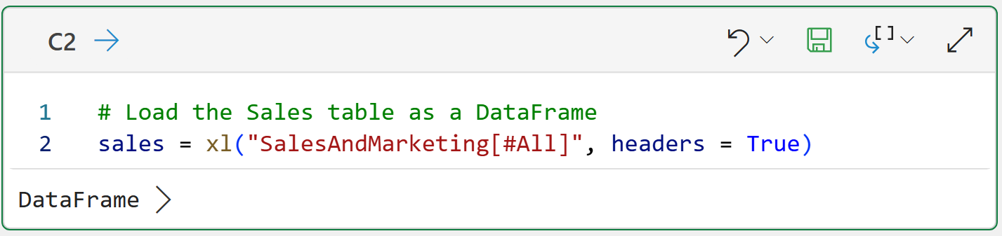The actual Python formulas I place in column C aligned to the comments. For example, here's the formula for cell C3 to load the SalesAndMarketing table into Python: