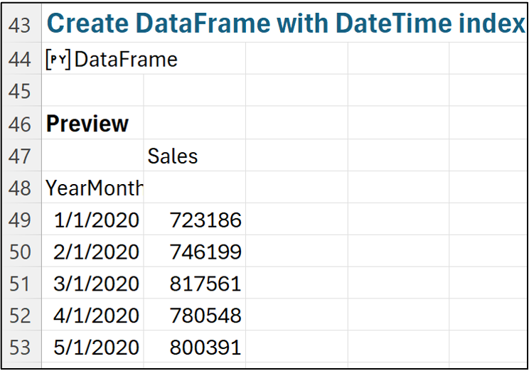 In response to the above prompt, Copilot will generate a new Python in Excel formula to set up the DataFrame. You will see something like the following in the worksheet as a result:
