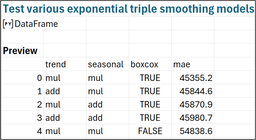 Python in Excel includes the mighty statsmodels library. Using statsmodels gives you access to many state-of-the-art forecasting techniques beyond exponential smoothing models.