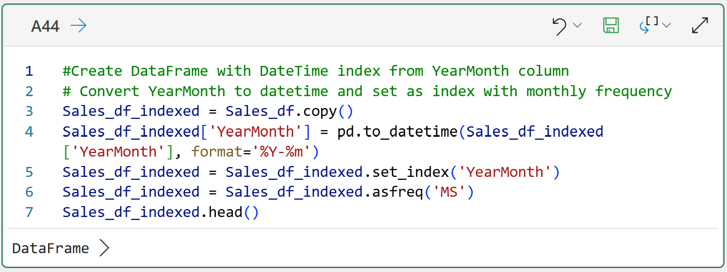 As covered in previous tutorials in this series, when building forecasting models with Python, it's a good idea to set the DataFrame index to be the timestamp of your time series. The following prompt will generate the code to do this: