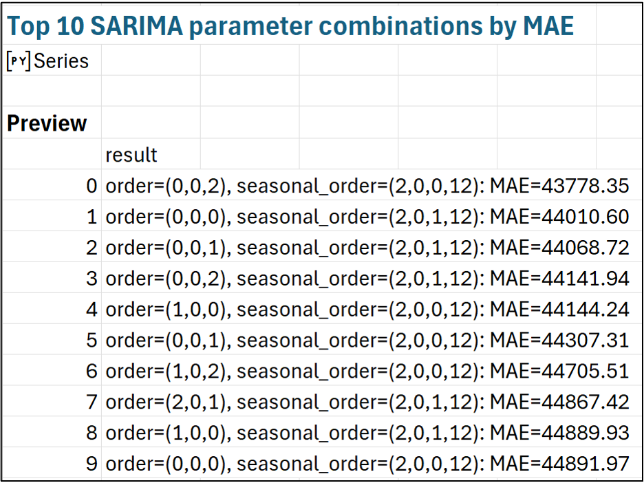 Assuming that the code is OK, the above output shows that every one of the top 10 SARIMA models produce better forecasts than the forecasts provided by using Excel's FORECAST.ETS() function.