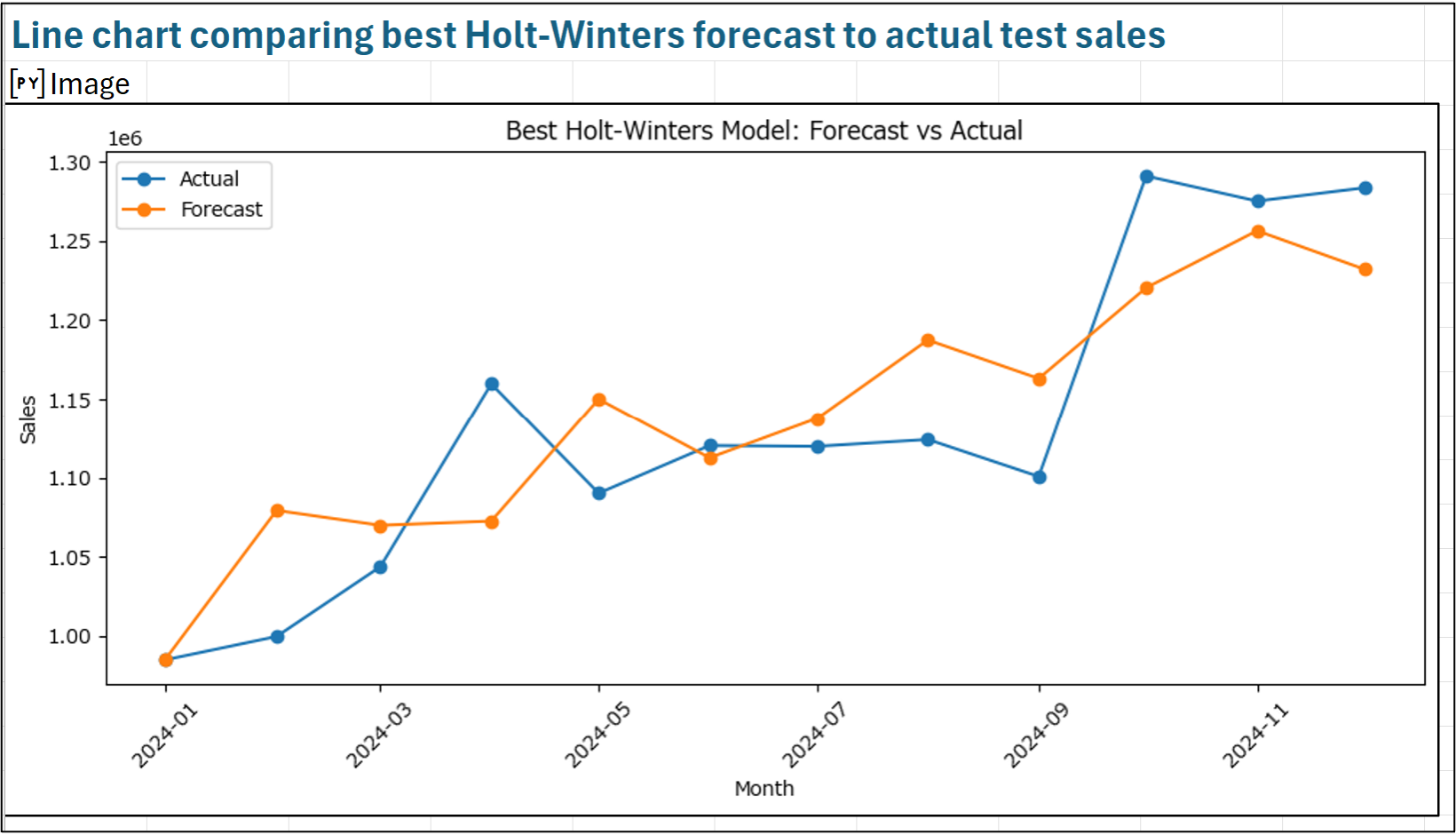 Create a line chart that compares the forecasts of the best exponential triple smoothing model to the actual values from the test data.