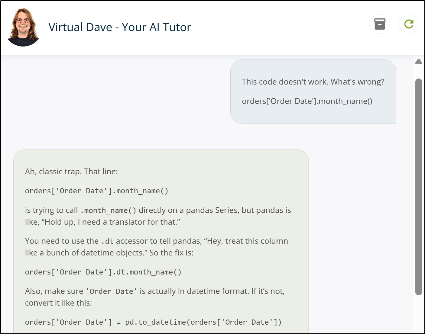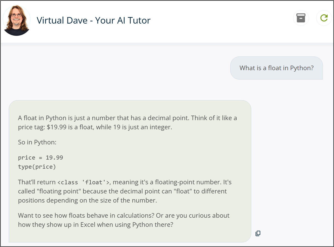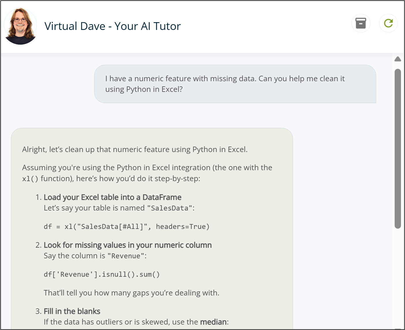Let me introduce you to Virtual Dave, your AI tutor. Virtual Dave is a customized and curated AI designed to help you learn Python in Excel fast. More importantly, Virtual Dave is available 24x7 to help you apply what you learn at work to make more impact and stand out from the crowd: