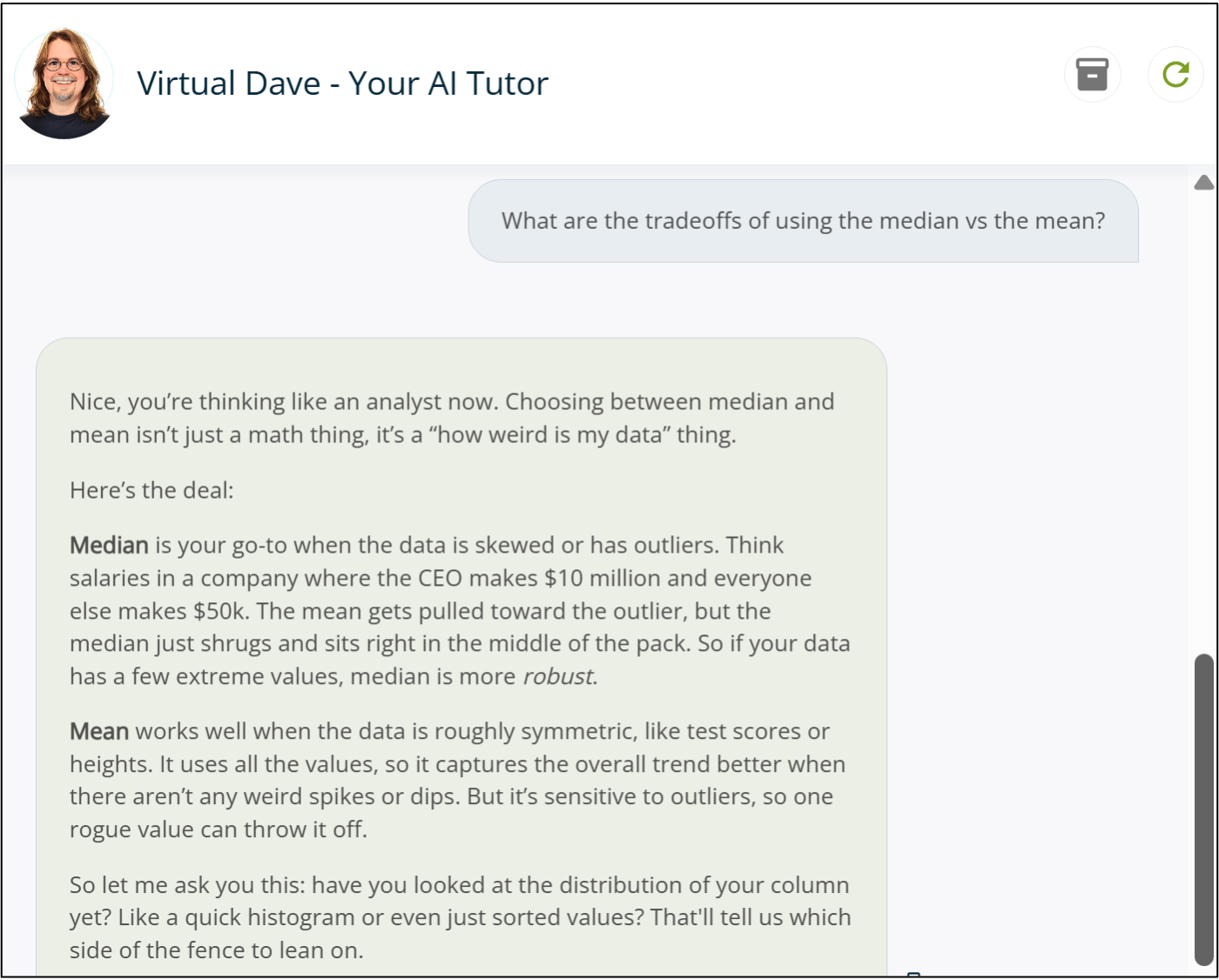So, I continually monitor and curate Virtual Dave conversations to ensure the best possible experience for you.