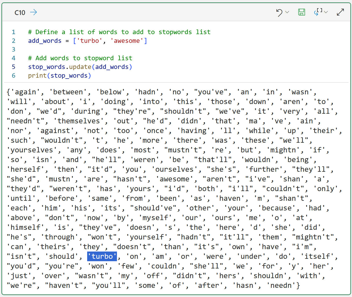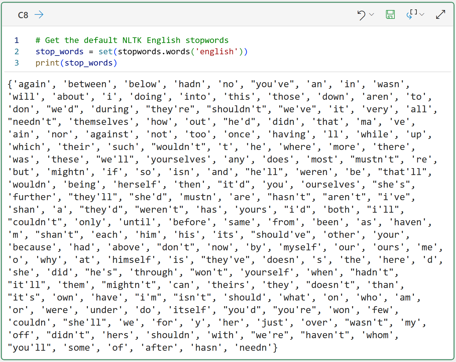 The above code demonstrates how to load and display the English stopwords list. One thing to note about the Python formula in cell C8 is that I'm using a Python set to improve performance.