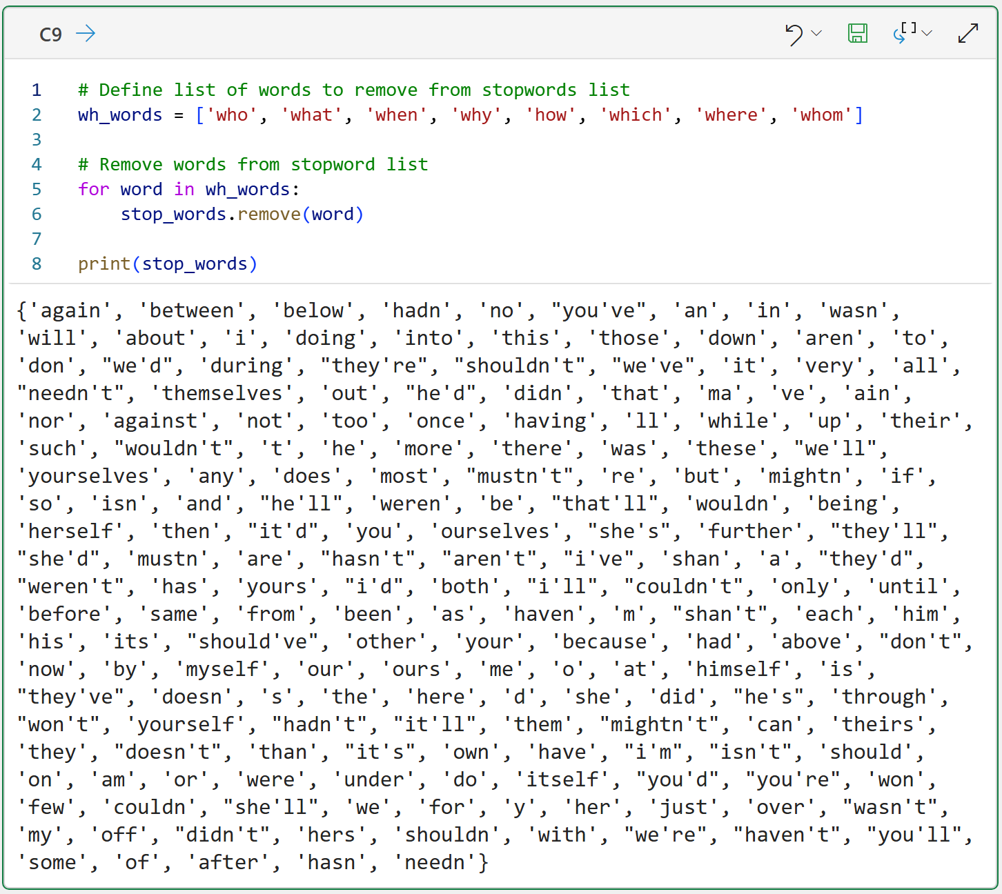 For example, if you're analyzing customer service chats, you might not want to remove words like: who, what, when, where, why, and how.