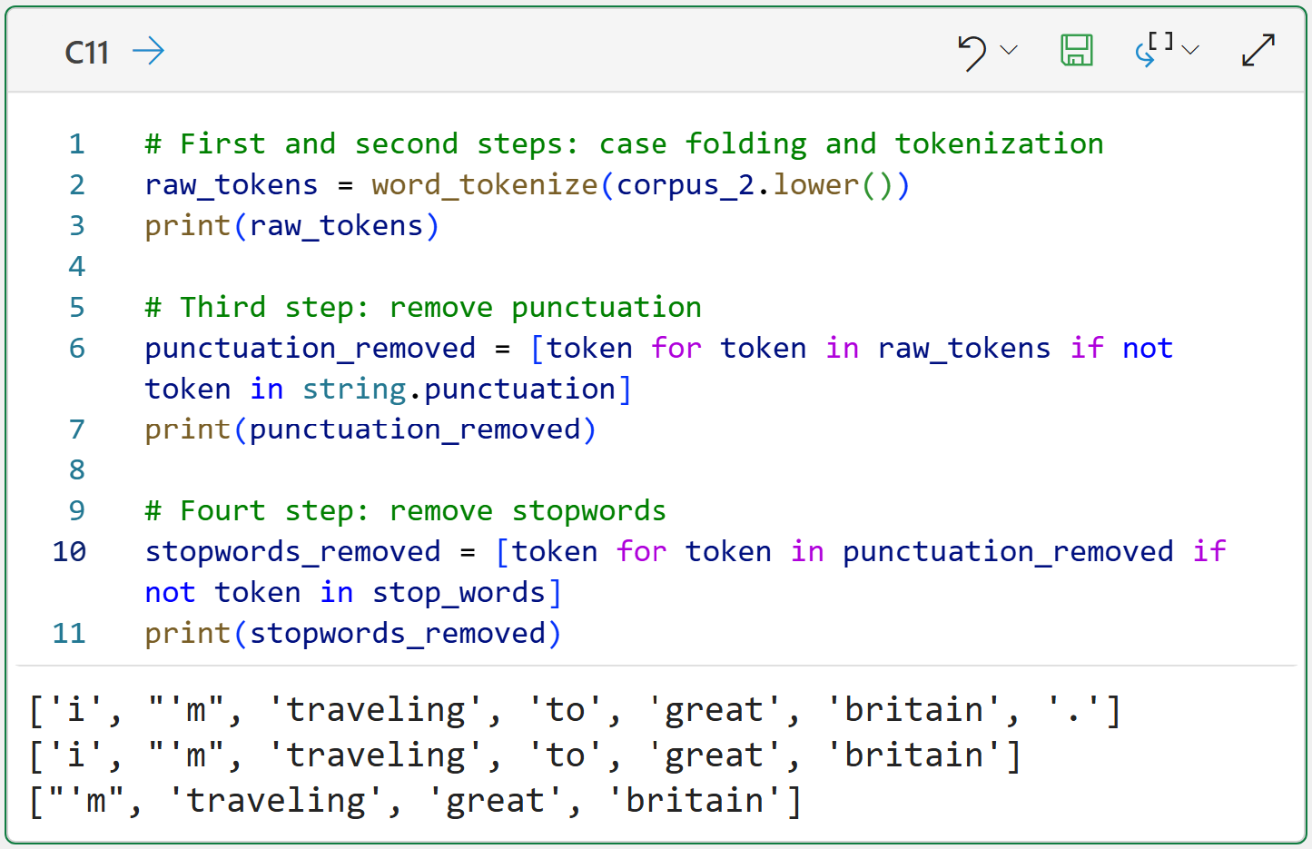 The Python formula also demonstrated how useful Python list comprehensions are when using the NLTK. In this case, the list comprehension only keeps tokens that are not in the punctuation list.