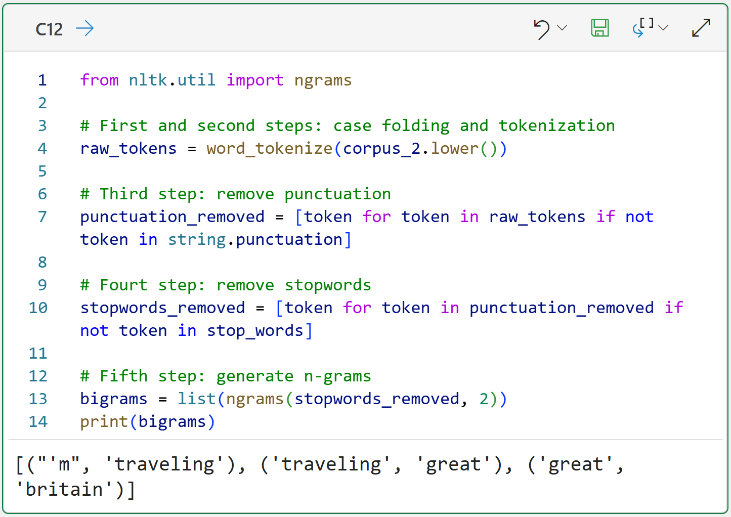 You can also create more complex n-grams. The following Python formula incorporates n-grams into the text preprocessing pipeline. Specifically, generating two-way combinations of single tokens, which are called bigrams or 2-grams: