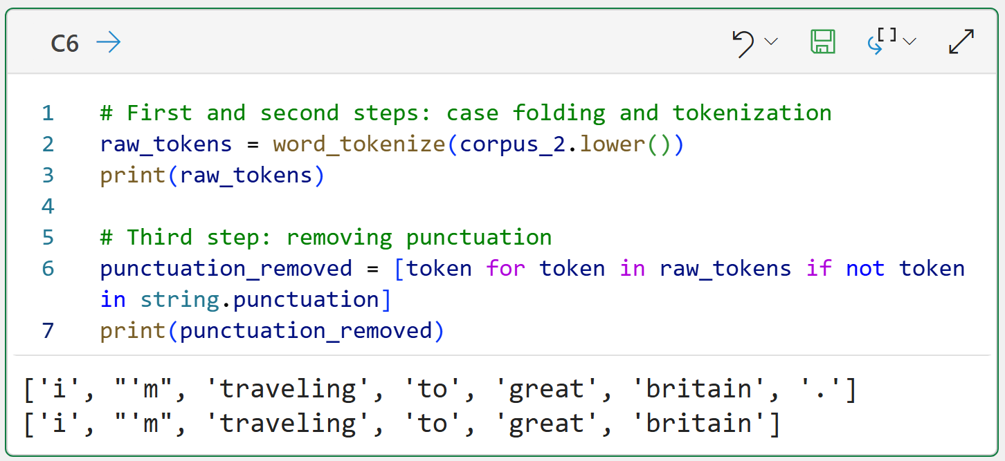 The Python formula in C6 demonstrates the logical idea of a text preprocessing pipeline in code. I'm going to extend the code throughout this tutorial so you can see the gradual transformation of the tokens through each step of the pipeline.