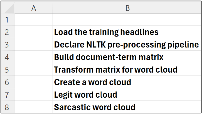 With the data loaded into Python in Excel, the next step in mining the headlines is building a document-term matrix.