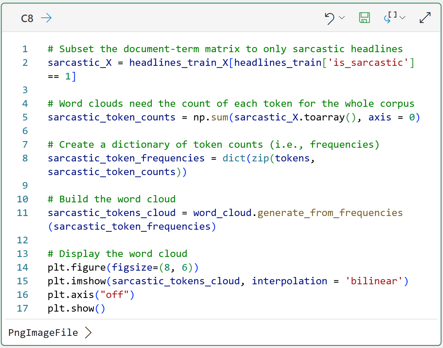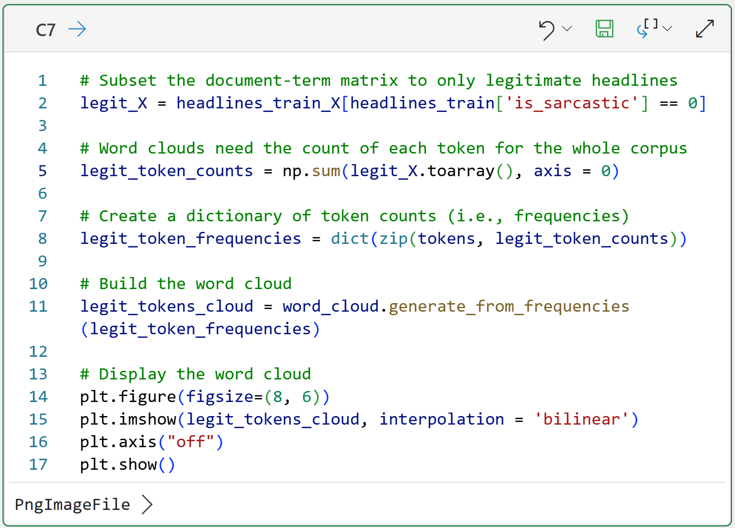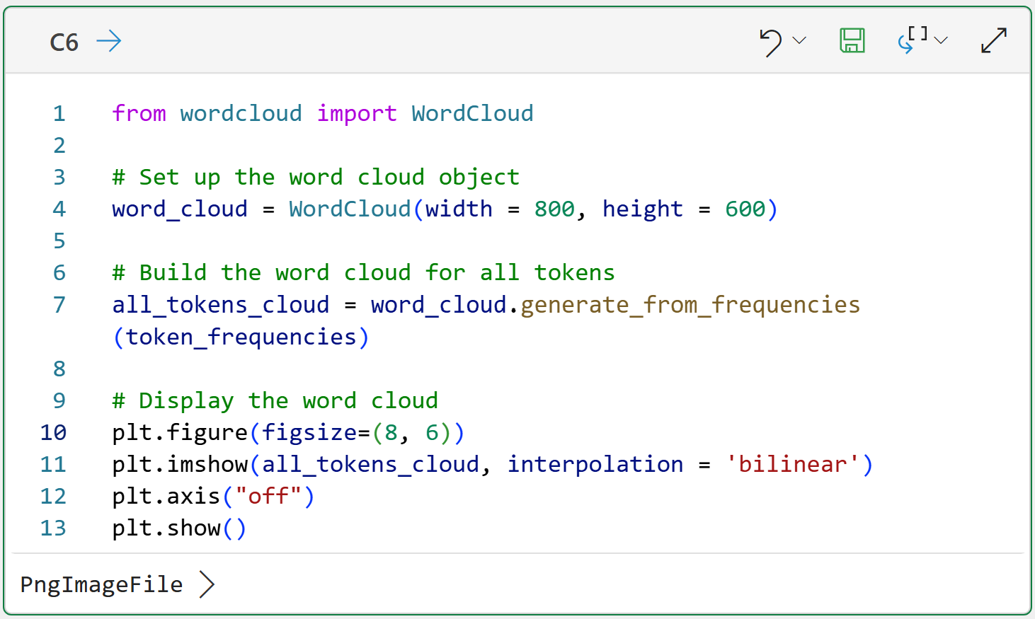 Line 7 generates the word cloud image using all of the token frequencies for the entire corpus.