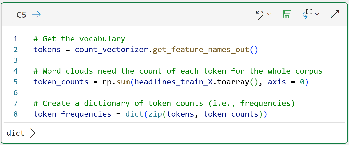 Line 5 counts how often each token occurs across the entire corpus.
