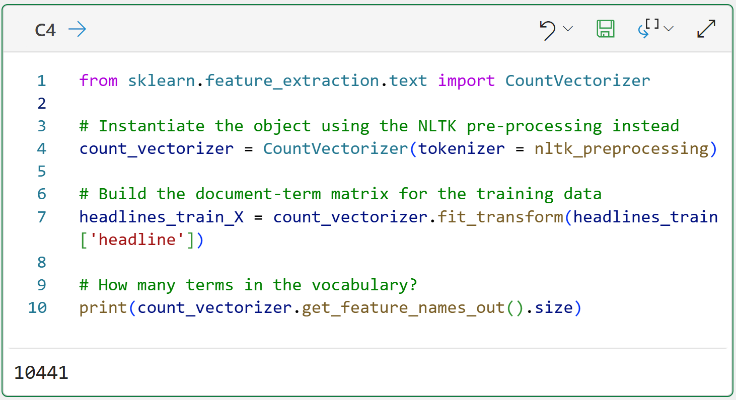 Also, check out the code on line 7 in cell C4. The code passes the headline column of the headlines_train DataFrame. This column contains 4,005 headlines, and each one will be passed to the nltk_preprocessing() function for tokenization.