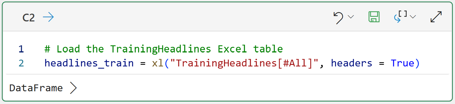 Before the text can be mined, the TrainingHeadlines table must be loaded into Python in Excel. Per my usual, I've set up the workbook with a dedicated Python Code worksheet.