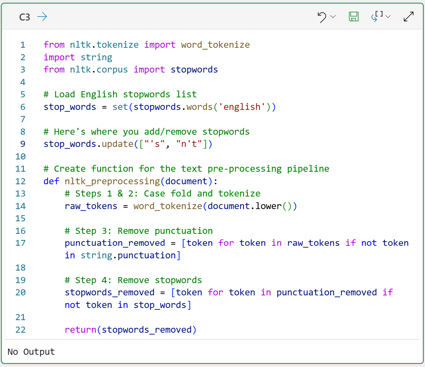 As covered in the last tutorial, it's a good idea to declare a function that implements a Natural Language Toolkit (NLTK)-based text pre-processing pipeline: