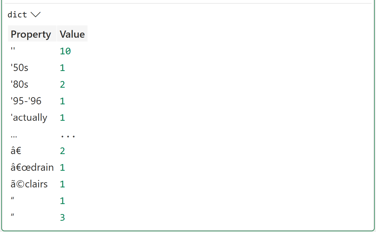 Line 8 creates a Python dictionary to store each token and its associated count.