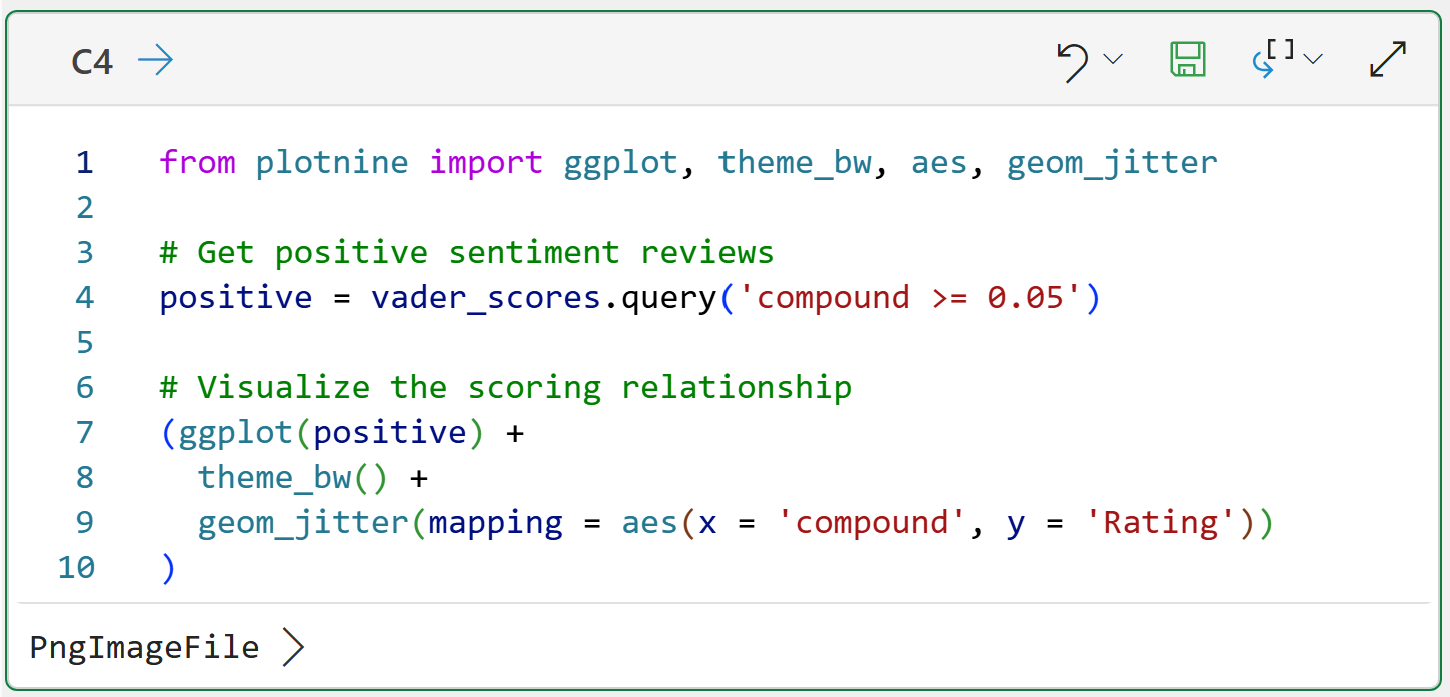The magic in cell C3 happens on line 7 of the Python code. The code uses a list comprehension to pass each Review to VADER for scoring.