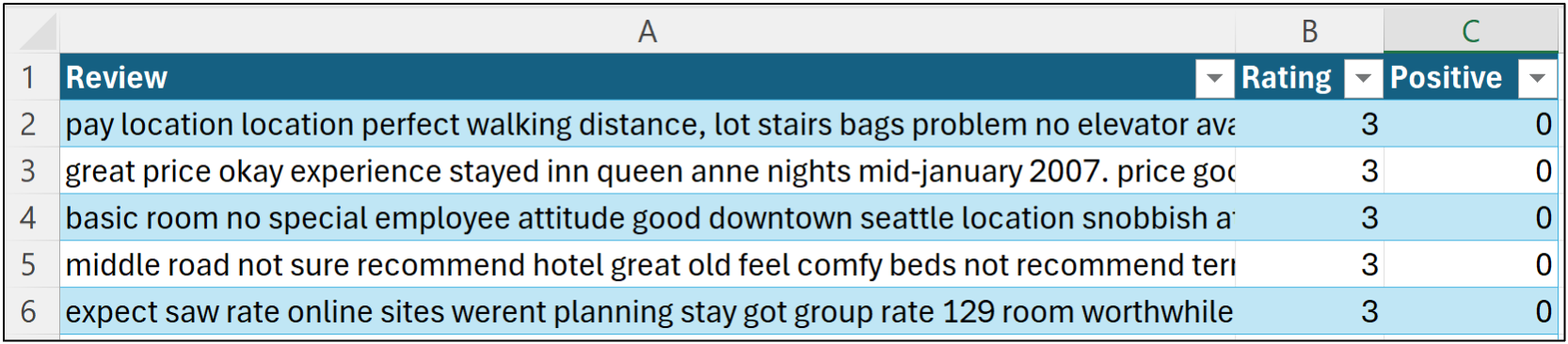The workbook also contains a HotelReviewsTest table in the event you would like to experiment with building a Naive Bayes classifier for predicting sentiment, as covered in Part 5 of this tutorial series.