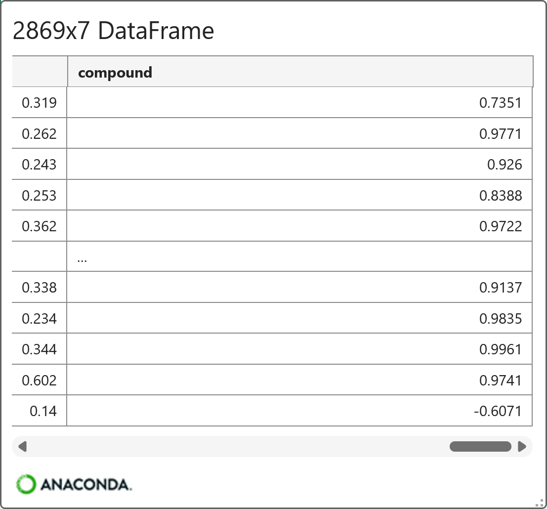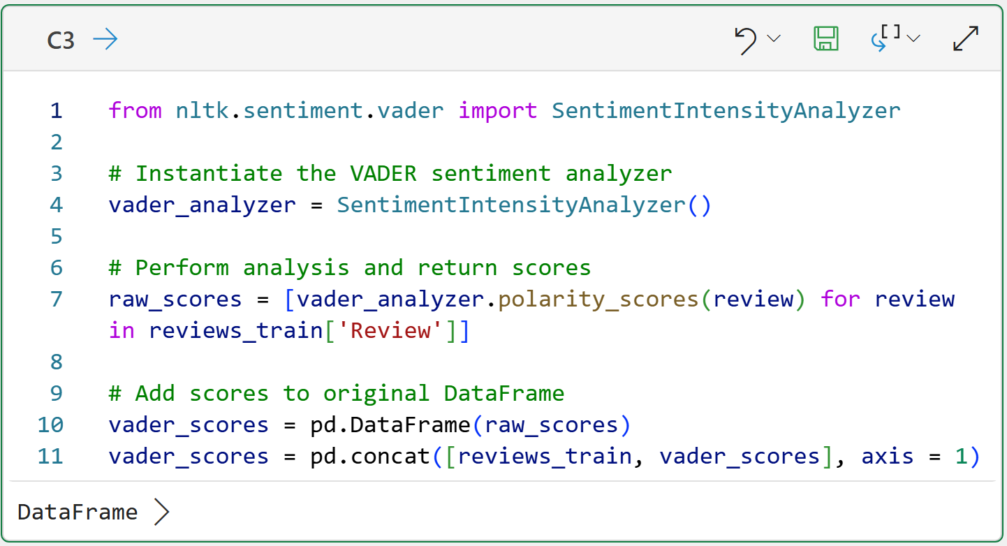 Lines 10 and 11 create a new DataFrame that combines review_train with the VADER scores. Clicking on the card by hovering your mouse over [PY] in the worksheet gives a preview: