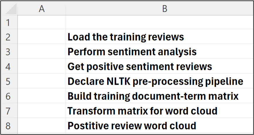 Then, place each Python in Excel formula to the right of your step-by-step documentation: