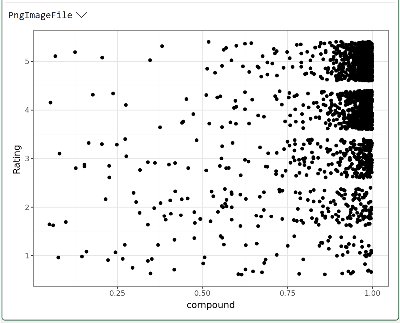 The above visual shows that the VADER compound score doesn't always align with the user-provided Rating. For example, there are a number of 1- and 2-star ratings with high compound scores.