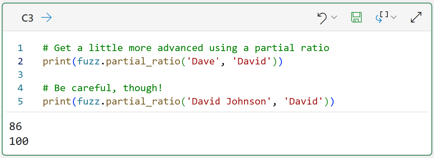 However, sometimes what you need is something a bit more sophisticated. Here's when the partial_ratio() function can be very handy: