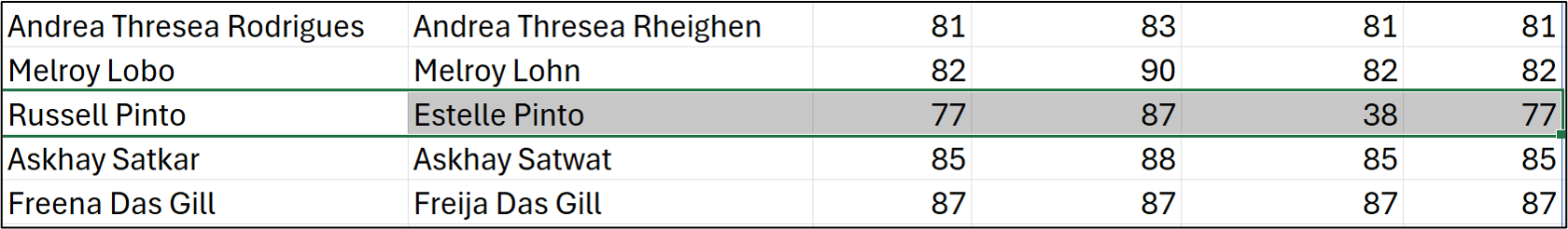 All the rows of name pairs, including the fuzzy matching scores, now appear in the worksheet: