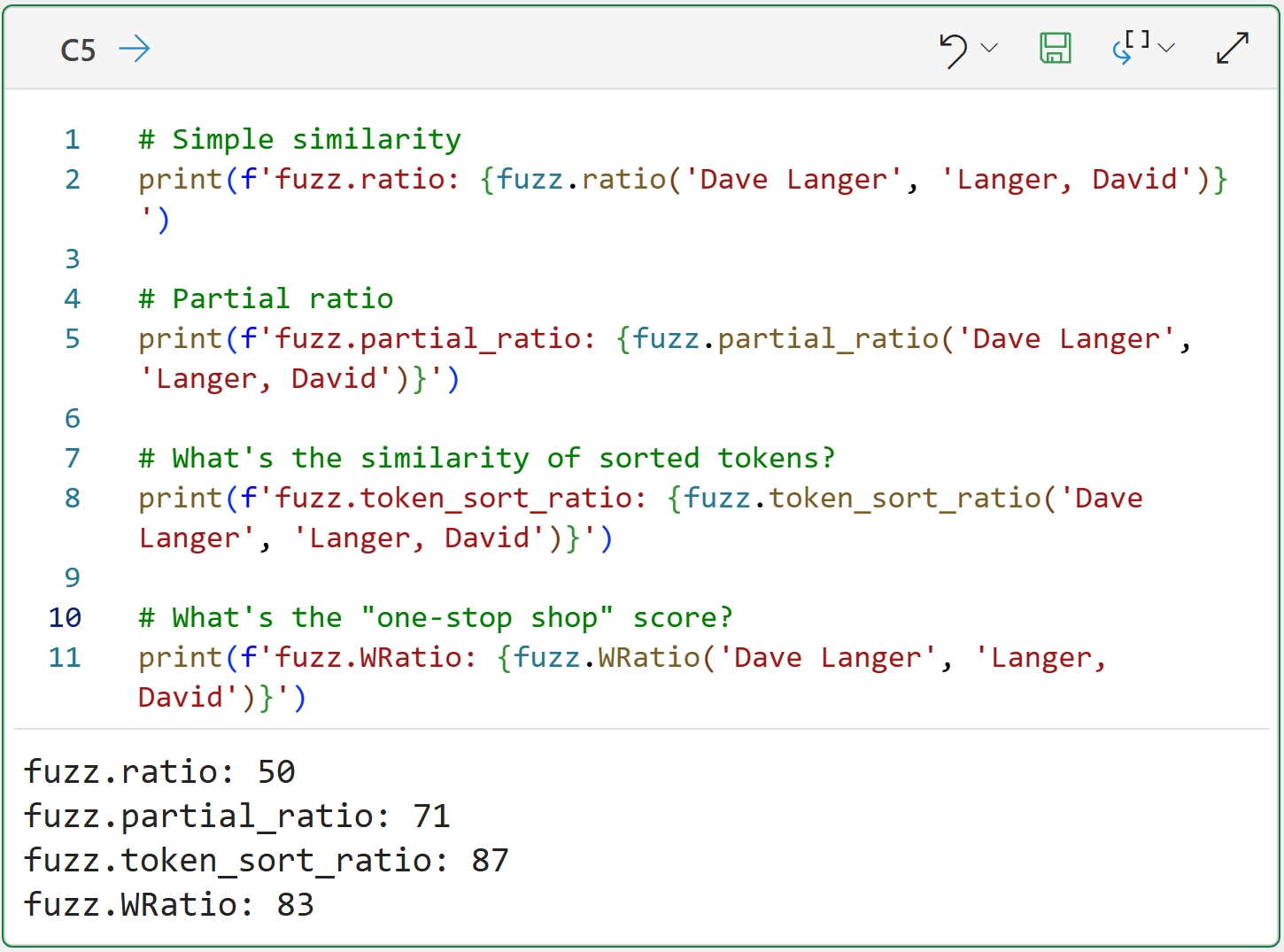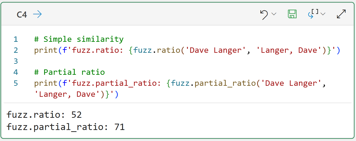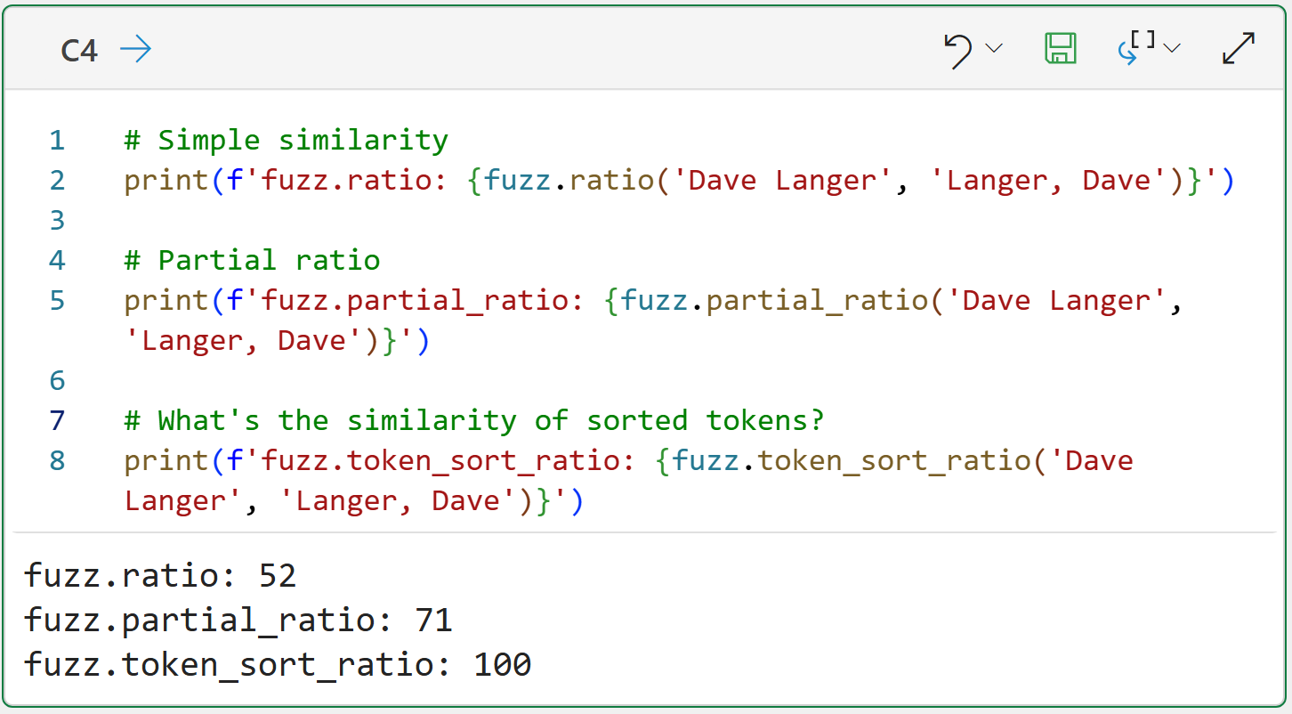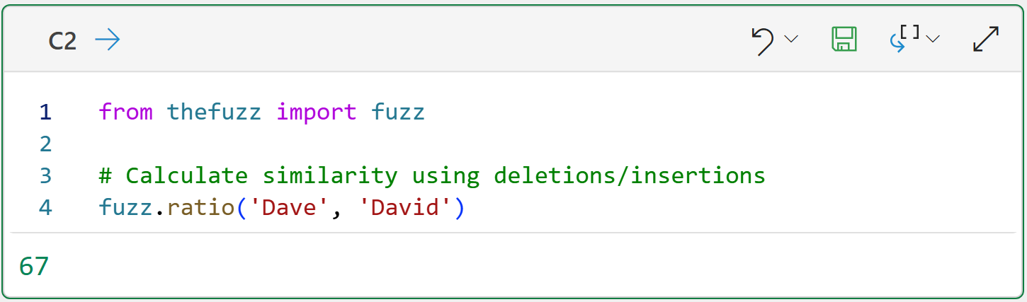 The code in cell C2 demonstrates how the ratio() function calculates the similarity score between two strings based on deletions and insertions using the math you learned about above, multiplied by 100.