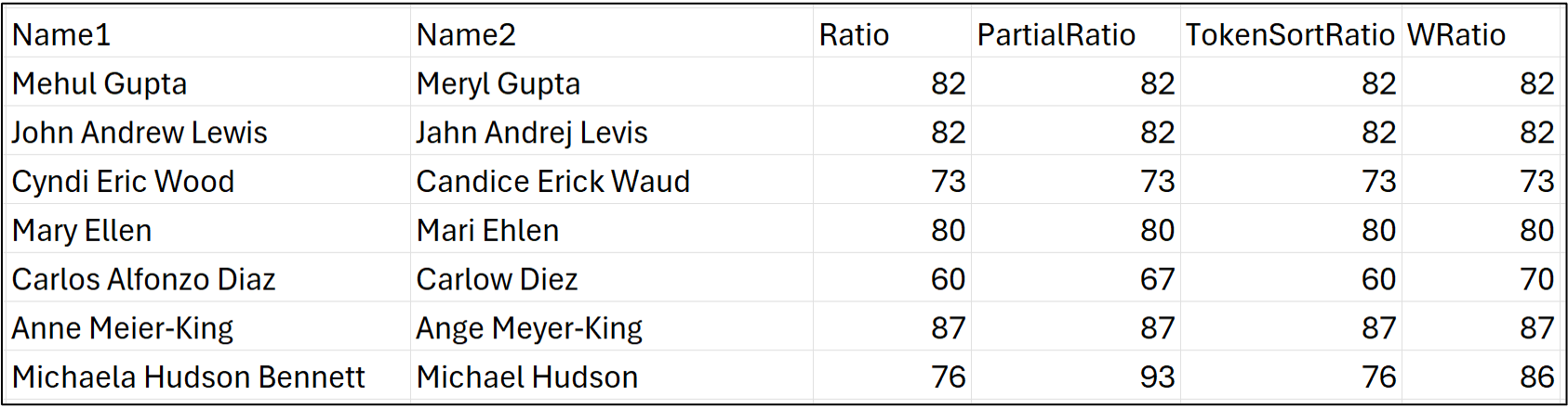 In this example, it's clear to our human eyes that these are most likely two different names, even though WRatio() scores the match at 91/100!