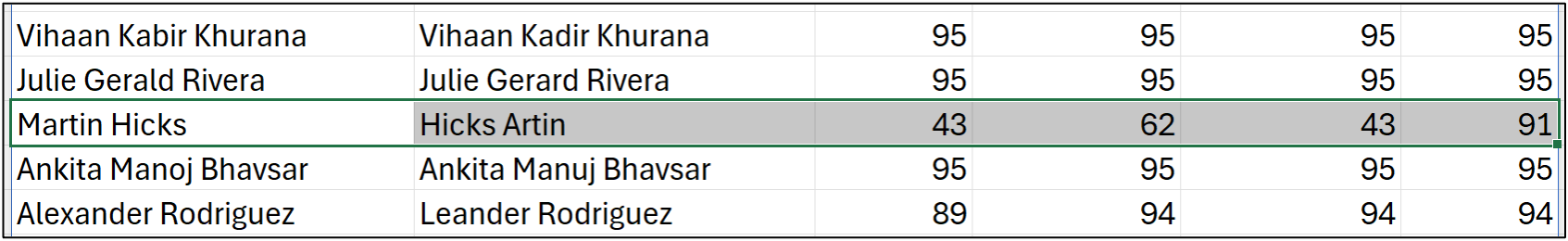 Likely Reorder/Formatted Match: Ratio < 70 and token_sort_ratio >= 90 and WRatio >= 85