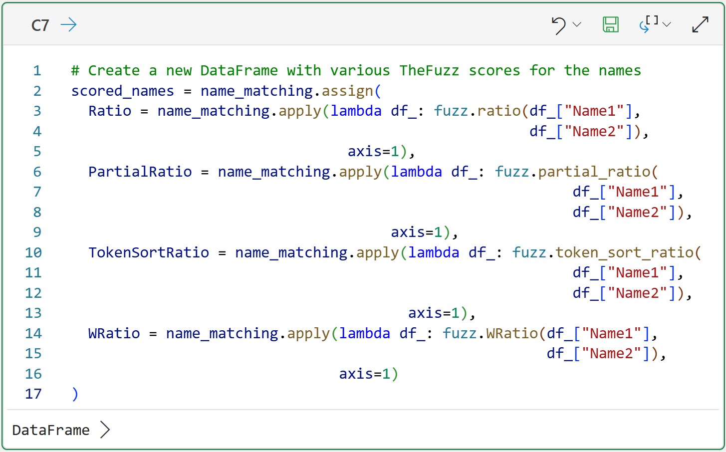 The following code applies each of the fuzzy matching functions covered so far in this tutorial to the NameMatching Excel table.