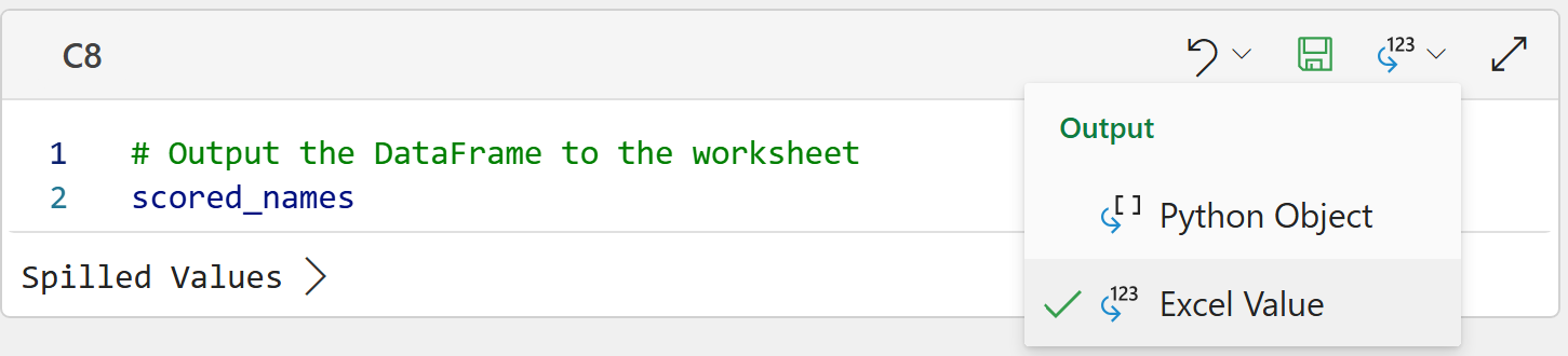 As it will be much easier to see the results of the fuzzy matching in the worksheet, the following Python formula displays (i.e., spills) scored_names to the worksheet: