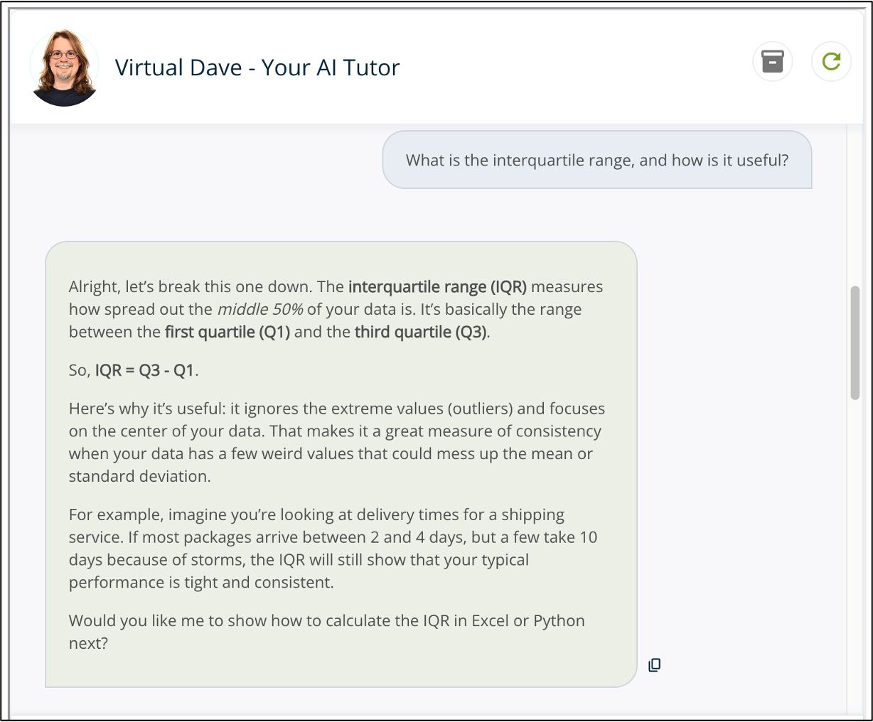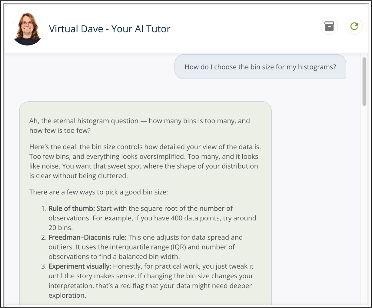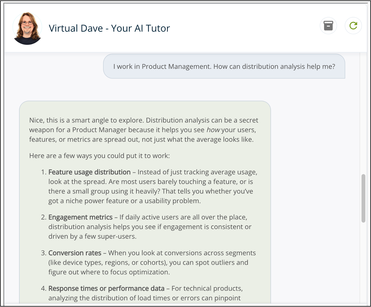 Let me introduce you to Virtual Dave, your AI tutor. Virtual Dave is a customized, curated AI designed to help you learn visual data analysis quickly. More importantly, Virtual Dave is available 24x7 to help you apply what you learn at work to make more impact and stand out from the crowd:
